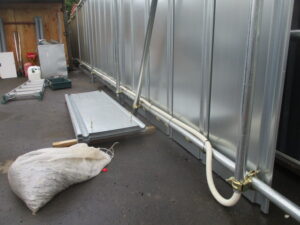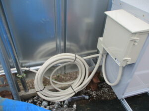 千葉県いすみ市の建築解体工事会社にて、防犯セキュリティ・カメラシステムの新規工事をしました。本日までにお客様のほうで敷地の入口ゲート建築とスーパーハウスの設置をして頂く予定だったのですが、先日営業のほうにご連絡いただき、まだ準備できてないのでできる所だけ先にやって欲しい、という流れに変更となりました。これにより本日はスーパーハウスが入るまでの仮設置として営業が用意した屋外用物置内に録画機器等を設置させていただき、とりあえずカメラシステムだけは生かしておきました。後日、入口ゲートとスーパーハウスの設置完了後に再度訪問させていただき、残りの工事分の施工に入らせていただきます。
